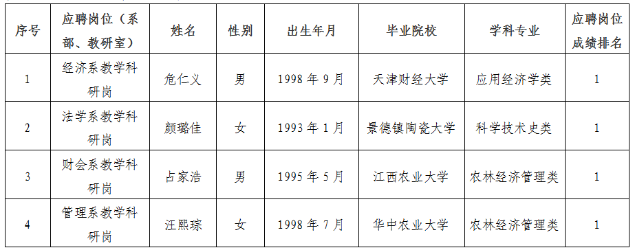 根据《景德镇陶瓷大学2026年高层次人才招聘公告》精神,经济管理与法学院开展了2026年第一批博士人才专业面试考核,现将入闱体检(心理测试)人员名单公布如下: